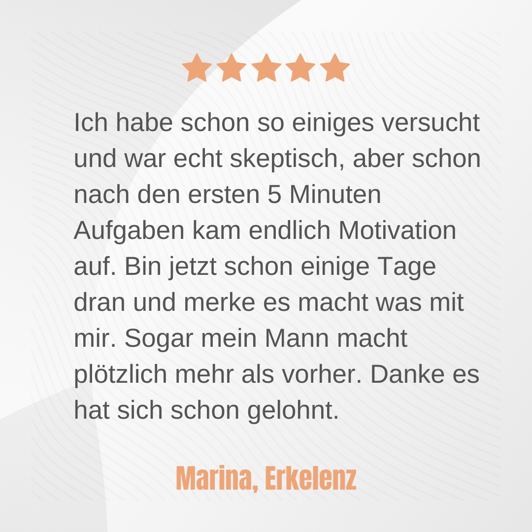 Du bekommst 15-Minuten-Aufgaben, die leicht umzusetzen sind und dir schnelle Ergebnisse liefern – ohne Grübeln, ohne Planungsstress und ohne Überforderung.